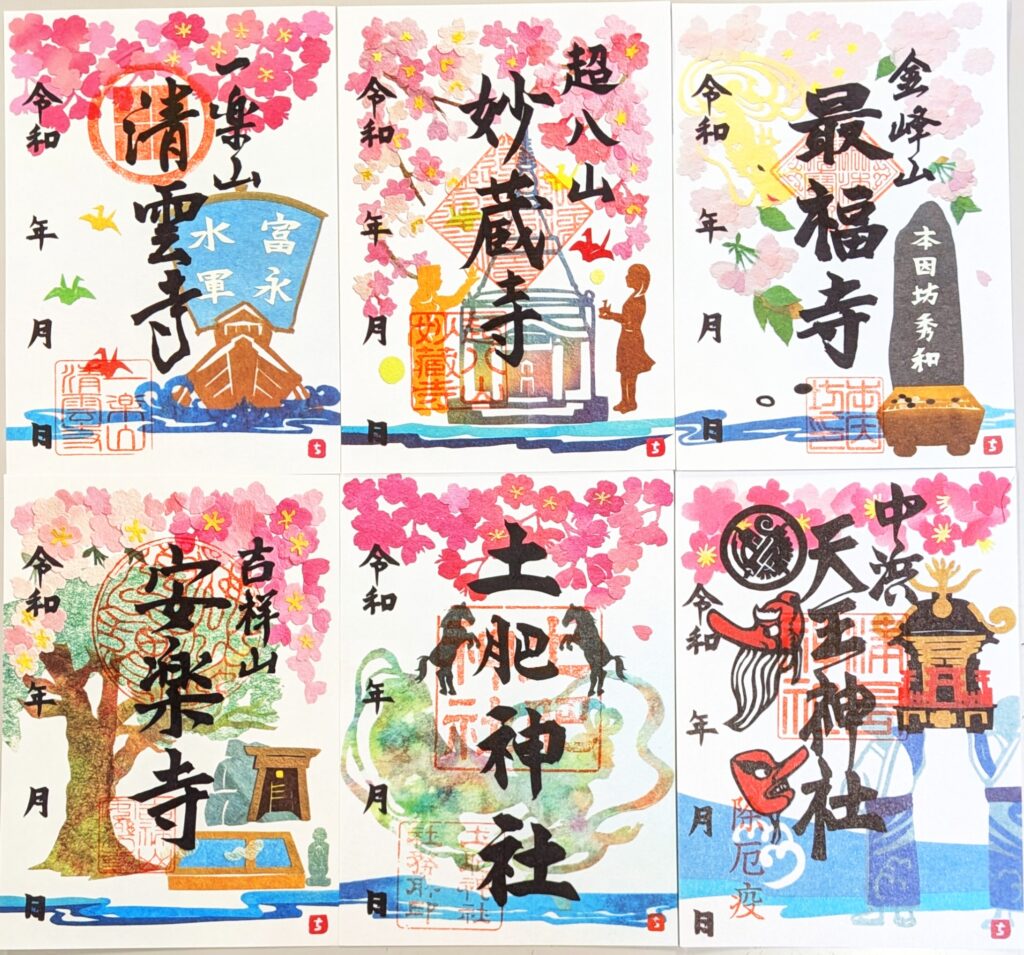土肥桜まつり限定御朱印は伊豆市生まれの紙切り作家・水口ちはるさんに創作をお願いしました。水口さんは宮司、住職から各寺社まつわる話を直接聞き、それぞれのシンボルなどを切り絵で表現し、人々がしあわせでありますようにと願いを込め切り絵の御朱印を創作しました。
