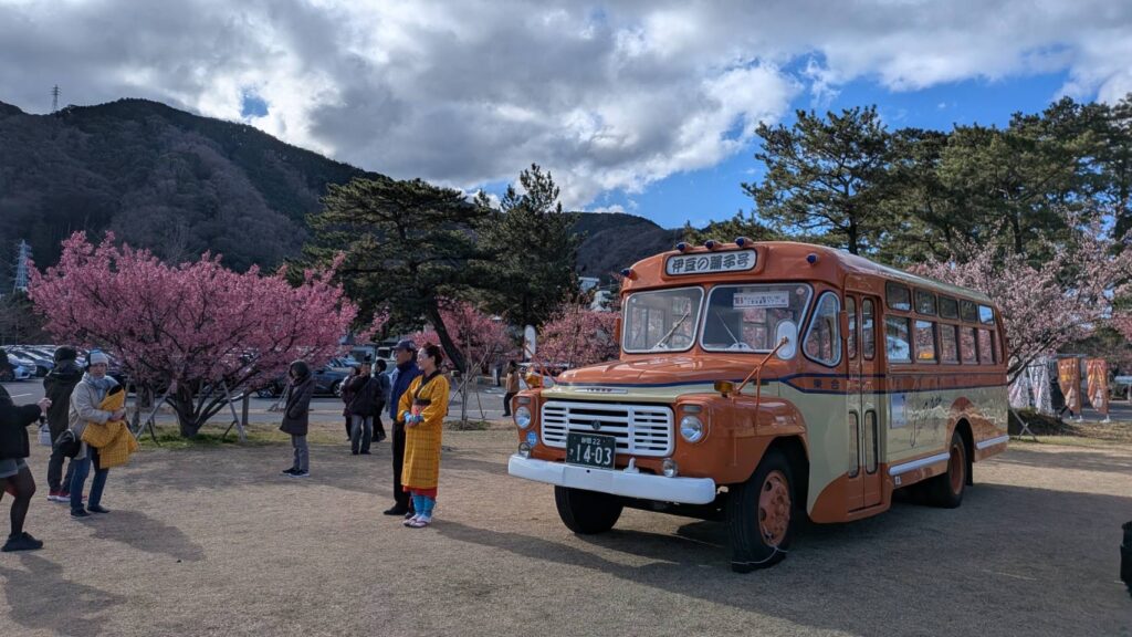 画像はボンネットバス「踊り子号」!かわいい踊り子さんもお待ちしております。土肥桜まだ満開が続いております。